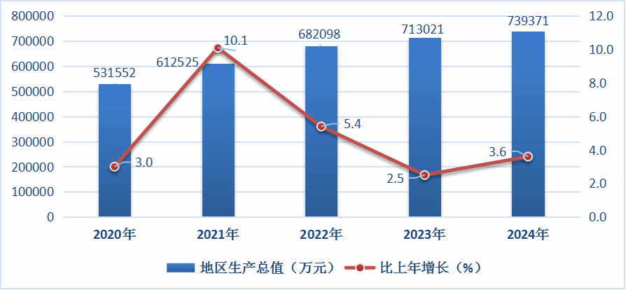 根據(jù)地區(qū)生產(chǎn)總值統(tǒng)一核算初步結(jié)果,2024年滄源實現(xiàn)地區(qū)生產(chǎn)總值(GDP)739371萬元,比上年增長3.6%。其中,第一產(chǎn)業(yè)增加值240808萬元,增長2.6%;第二產(chǎn)業(yè)增加值182647萬元,增長3.7%;第三產(chǎn)業(yè)增加值315916萬元,增長4.1%。三次產(chǎn)業(yè)結(jié)構(gòu)為32.6:24.7:42.7。全縣人均地區(qū)生產(chǎn)總值48309元,比上年增長5.7%。
