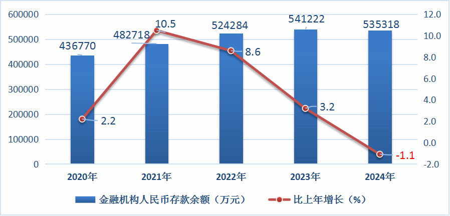 年末金融機構(gòu)人民幣存款余額535318萬元,比年初減少5904萬元,比上年下降1.1%。其中,住戶存款375732萬元,增長5.0%。