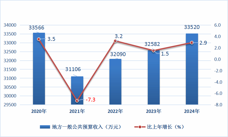 全年全縣財政總收入完成50982萬元,按自然口徑計算下降4.4%。地方一般公共預(yù)算收入完成33520萬元,增長2.9%。其中,稅收收入完成17554萬元,下降2.9%;非稅收入完成15966萬元,增長10.1%。