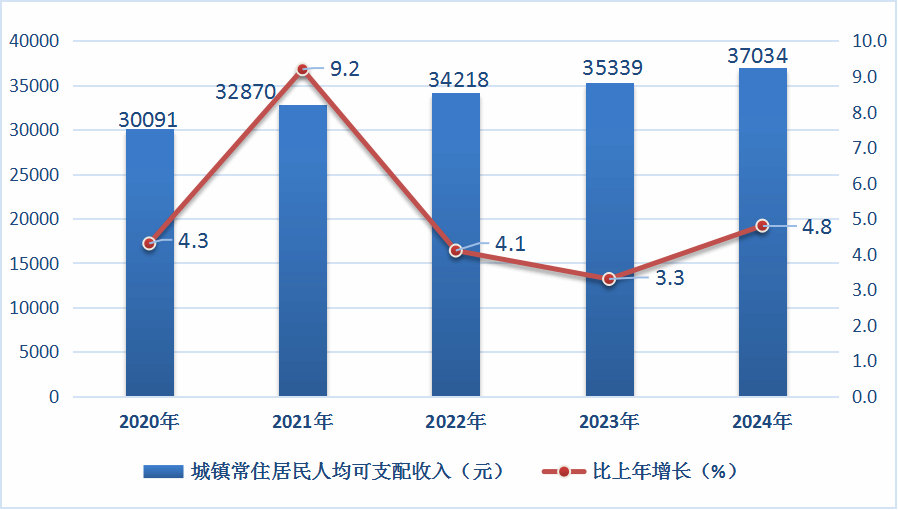圖10?2020—2024年滄源縣城鎮(zhèn)常住居民人均可支配收入及增長速度