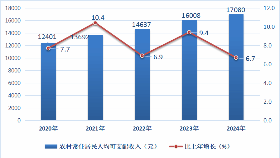 圖11 2020—2024年滄源縣農(nóng)村常住居民人均可支配收入及增長速度