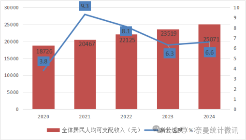 2020-2024年奈曼旗全體居民人均可支配收入及其增速