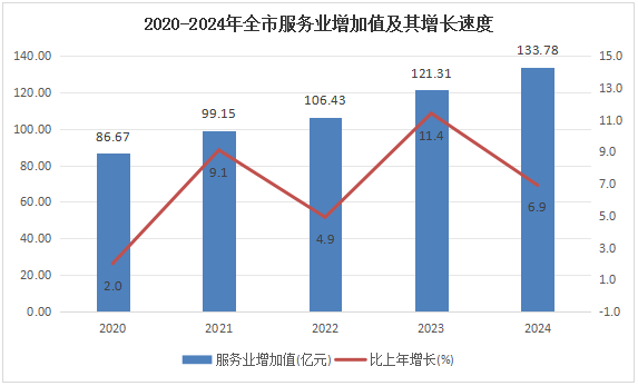 全年全市服務(wù)業(yè)增加值133.78億元,按不變價(jià)格計(jì)算,比上年增長6.9%。其中,批發(fā)和零售業(yè)增加值34.17億元,增長9.8%;交通運(yùn)輸、倉儲和郵政業(yè)增加值18.67億元,增長15.6%;住宿和餐飲業(yè)增加值3.78億元,增長18.8%;金融業(yè)增加值6.52億元,增長12.2%;房地產(chǎn)業(yè)增加值11.53億元,下降0.1%;營利性服務(wù)業(yè)增加值23.27億元,增長4.6%;非營利性服務(wù)業(yè)增加值35.36億元,增長2.4%。