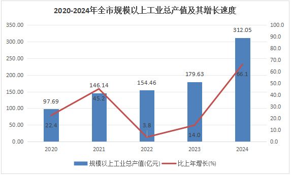 全年全市規(guī)模以上工業(yè)企業(yè)總產(chǎn)值完成312.05億元,比上年增長66.1%,達(dá)到了“十三五”末的3.2倍。