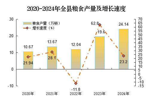 全年糧食產(chǎn)量24.14萬噸,較上年增加4.54萬噸,同比增長23.2%。其中:小麥產(chǎn)量10.07萬噸,較上年減少0.4萬噸,同比下降3.8%;玉米產(chǎn)量13.75萬噸,較上年增加4.7萬噸,同比增長51.9%。