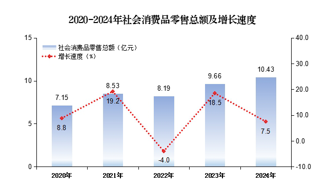 全年社會消費品零售總額完成103810萬元,同比增長7.5%。按城鄉(xiāng)劃分,城鎮(zhèn)零售額78376萬元,同比增長8.3%;鄉(xiāng)村零售額25434萬元,同比增長4.9%。按行業(yè)劃分,批發(fā)零售業(yè)完成零售額74016萬元,同比增長7.9%,住宿和餐飲業(yè)完成零售額29794萬元,同比增長6.3%。限額以上社會消費品零售總額完成54006萬元,同比增長11.1%。