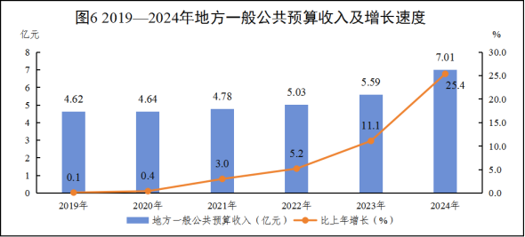 全年地方一般公共預(yù)算收入7.01億元,比上年增長(zhǎng)25.4%。其中,稅收收入2.94億元,增長(zhǎng)10.6%。一般公共預(yù)算支出68.33億元,增長(zhǎng)15.9%。