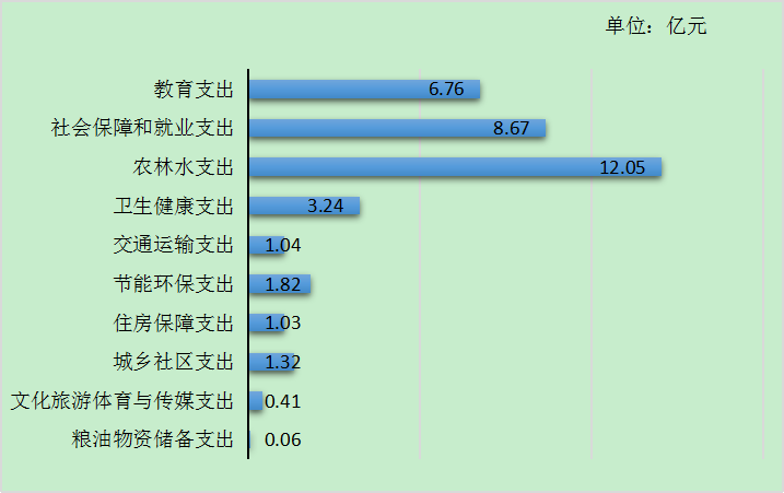 2024年全年地方一般公共預(yù)算支出43.15億元,同比增長21.8%,其中,一般公共服務(wù)支出2.50億元,增長34.8%;教育支出6.76億元,增長0.1%;文化旅游體育與傳媒支出0.41億元,增長11.9%;社會保障和就業(yè)支出8.67億元,增長7.5%;衛(wèi)生健康支出3.24億元,下降10.6%;節(jié)能環(huán)保支出1.82億元,增長39.6%;農(nóng)林水支出12.05億元,增長76.5%;城鄉(xiāng)社區(qū)支出1.32億元,增長72.0%;住房保障支出1.03億元,增長18.4%。