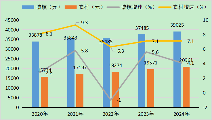 2024年全年城鄉(xiāng)居民人均可支配收入28828元,比去年同期增加1456元,同比增長5.3%。其中,城鎮(zhèn)常住居民人均可支配收入39025元,比去年同期增加1540元,同比增長4.1%;農(nóng)村常住居民人均可支配收入20961元,比去年同期增加1390元,同比增長7.1%。全體常住居民人均生活消費支出21434元,比去年同期增加1735元,同比增長8.8%。其中,城鎮(zhèn)常住居民人均生活消費支出26571元,同比增長8.7%;農(nóng)村常住居民人均生活消費支出17472元,同比增長8.9%。