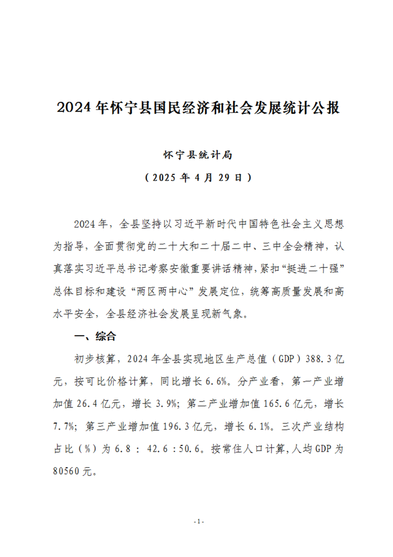 2024年安慶市懷寧縣人民政府國民經(jīng)濟(jì)和社會發(fā)展統(tǒng)計公報(2025年更新)