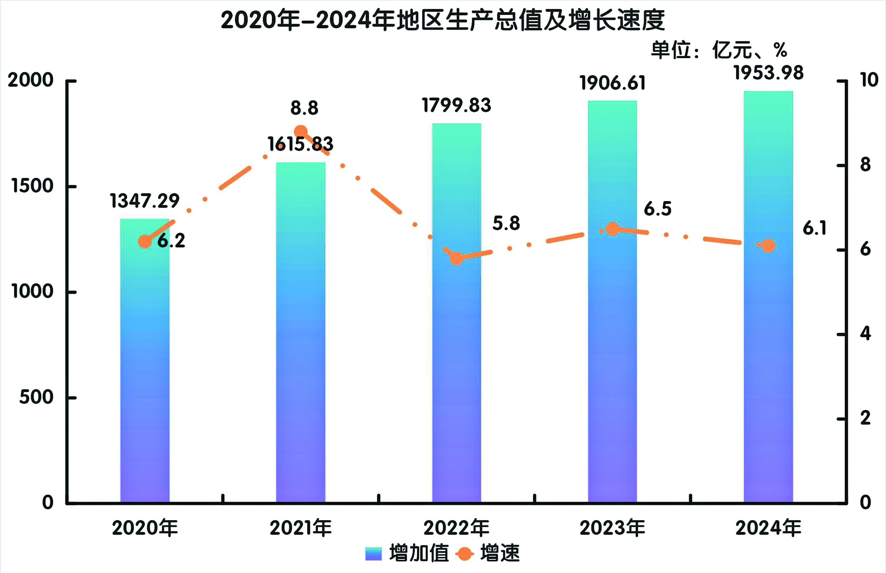 經(jīng)自治區(qū)統(tǒng)一初步核算,全年地區(qū)生產(chǎn)總值(GDP)1953.98億元,按可比價(jià)計(jì)算,比上年增長6.1%。其中,第一產(chǎn)業(yè)增加值426.67億元,增長6.1%;第二產(chǎn)業(yè)增加值669.65億元,增長8.7%;第三產(chǎn)業(yè)增加值857.66億元,增長4.5%;三次產(chǎn)業(yè)結(jié)構(gòu)比為21.8:34.3:43.9。
