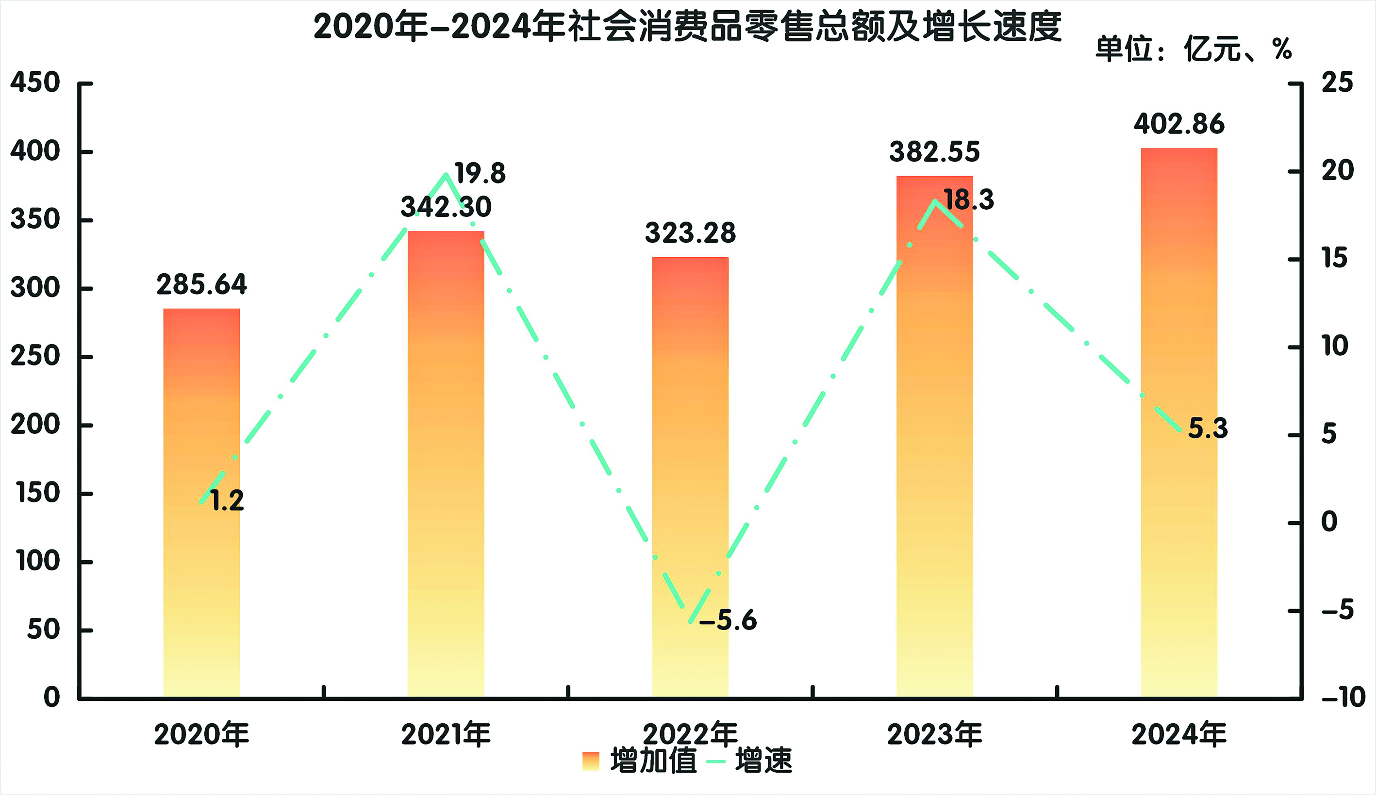 全年地區(qū)社會(huì)消費(fèi)品零售總額402.86億元,比上年增長5.3%。按經(jīng)營地分,城鎮(zhèn)消費(fèi)品零售額334.18億元,增長5.6%;鄉(xiāng)村消費(fèi)品零售額68.68億元,增長4.0%。按消費(fèi)類型分,商品零售331.89億元,增長5.0%;餐飲收入70.96億元,增長6.9%。