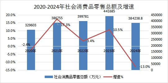 全年社會(huì)消費(fèi)品零售總額完成384238.8萬元,比上年下降13.0%,其中:限額以上消費(fèi)品零售總額120232.4萬元,下降11.4%
