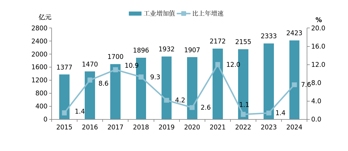 圖3 ?2014-2024年工業(yè)增加值及增長(zhǎng)速度