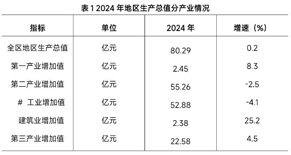 初步核算,全區(qū)地區(qū)生產(chǎn)總值80.29億元,按不變價格計算,比上年增長0.2%。其中,第一產(chǎn)業(yè)增加值2.45億元,比上年增長8.3%;第二產(chǎn)業(yè)增加值55.26億元,下降2.5%;第三產(chǎn)業(yè)增加值22.58億元,增長4.5%。三次產(chǎn)業(yè)結(jié)構(gòu)比例為3.1:68.8:28.1。(見表1)