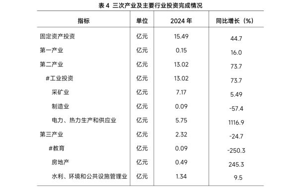 固定資產(chǎn)投資15.49億元,比上年增長44.7%,其中設(shè)備工器具購置投資增長388.4%。按產(chǎn)業(yè)劃分,第一產(chǎn)業(yè)投資0.15億元,增長16.0%;第二產(chǎn)業(yè)投資13.02億元,增長73.7%;第三產(chǎn)業(yè)投資2.32億元,下降24.7%。(見表4)