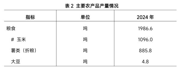 糧食作物播種面積322公頃,全年糧食總產(chǎn)量1986.6噸。在糧食作物中,玉米產(chǎn)量1096.0噸、馬鈴薯產(chǎn)量(折糧)885.8噸、大豆產(chǎn)量4.8噸。糧食平均畝產(chǎn)411公斤。(見表2)