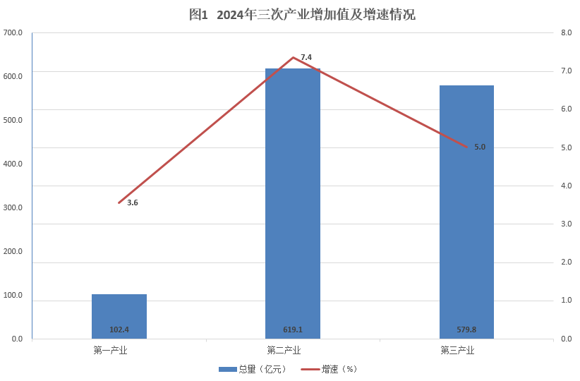 經(jīng)濟(jì)總量穩(wěn)步提升。根據(jù)生產(chǎn)總值統(tǒng)一核算結(jié)果,2024年全區(qū)地區(qū)生產(chǎn)總值[2]1301.3億元,比上年增長(zhǎng)[3]6.0%。其中,第一產(chǎn)業(yè)增加值102.4億元,同比增長(zhǎng)3.6%。第二產(chǎn)業(yè)增加值619.1億元,增長(zhǎng)7.4%。第三產(chǎn)業(yè)增加值579.8億元,增長(zhǎng)5.0%。三次產(chǎn)業(yè)構(gòu)成比例為7.87:47.57:44.56。