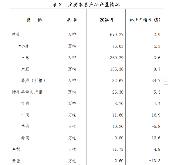 全年豬牛羊禽肉產(chǎn)量26.30萬噸,比上年增長5.3%。其中,豬肉產(chǎn)量3.70萬噸,比上年增長4.4%;牛肉產(chǎn)量11.60萬噸,增長16.9%;羊肉產(chǎn)量10.20萬噸,下降5.8%;禽肉產(chǎn)量0.80萬噸,增長13.6%。禽蛋產(chǎn)量2.60萬噸,下降13.3%。牛奶產(chǎn)量71.73萬噸,下降4.8%。(見表2)