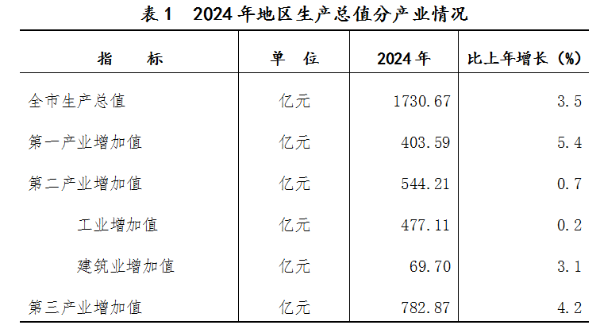 初步核算,全年地區(qū)生產(chǎn)總值(GDP)[2]1730.67億元,比上年增長3.5%。分產(chǎn)業(yè)看,第一產(chǎn)業(yè)增加值403.59億元,比上年增長5.4%;第二產(chǎn)業(yè)增加值544.21億元,增長0.7%;第三產(chǎn)業(yè)增加值782.87億元,增長4.2%。三次產(chǎn)業(yè)結(jié)構(gòu)比例為23.3:31.4:45.2。第一、二、三產(chǎn)業(yè)對地區(qū)生產(chǎn)總值增長的貢獻(xiàn)率分別為36.0%、5.3%和58.7%。全年人均地區(qū)生產(chǎn)總值80310元,比上年增長4.7%。(見表1)