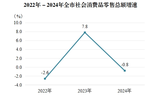 全年社會消費(fèi)品零售總額比上年下降0.8%。按經(jīng)營地分,城鎮(zhèn)消費(fèi)品零售額下降0.7%,鄉(xiāng)村消費(fèi)品零售額下降1.8%;按消費(fèi)類型分,商品零售額下降1.2%,餐飲收入額增長3.8%。