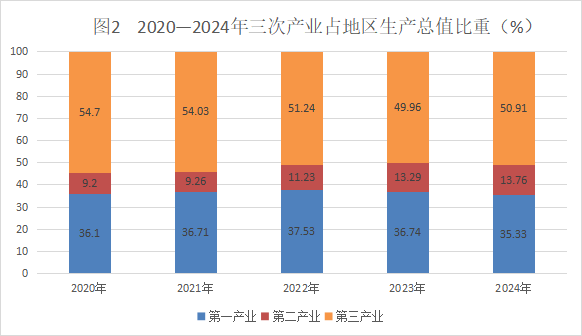 第一產(chǎn)業(yè)增加值占國內(nèi)生產(chǎn)總值比重為35.3%,第二產(chǎn)業(yè)增加值比重為13.8%,第三產(chǎn)業(yè)增加值比重為50.9%。分季度看,一季度國內(nèi)生產(chǎn)總值同比增長5.2%,二季度增長3.4%,三季度增長4.2%,四季度增長5.2%。