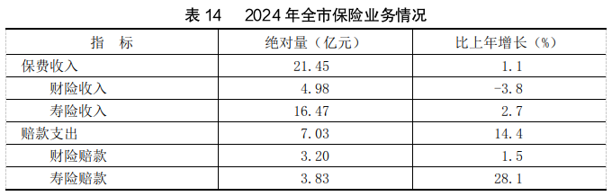 全年全市保險(xiǎn)業(yè)保費(fèi)收入21.45億元,比上年增長1.1%。保險(xiǎn)賠款支出7.03億元,增長14.4%。財(cái)險(xiǎn)機(jī)構(gòu)綜合賠付率66.36%。