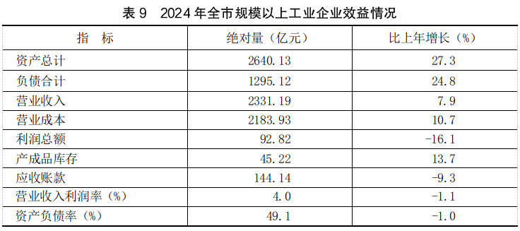 全年全市規(guī)模以上工業(yè)企業(yè)利潤92.82億元,比上年下降16.1%。規(guī)模以上工業(yè)企業(yè)每百元營業(yè)收入成本93.68元。年末規(guī)模以上工業(yè)企業(yè)資產(chǎn)負(fù)債率為49.1%。每百元營業(yè)收入中的費(fèi)用2.52元。產(chǎn)成品存貨周轉(zhuǎn)天數(shù)為3.7天。營業(yè)收入利潤率為4.0%。