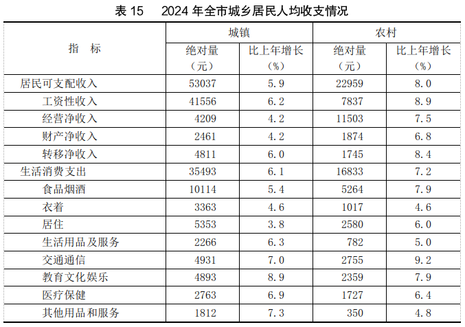 全年全市城鎮(zhèn)居民人均可支配收入53037元,比上年增長5.9%,其中:永昌縣40871元,增長5.8%;金川區(qū)58971元,增長6.0%。城鎮(zhèn)居民人均生活消費(fèi)支出35493元,恩格爾系數(shù)為28.5%。農(nóng)村居民人均可支配收入22959元,增長8.0%,其中:永昌縣21393元,增長8.1%;金川區(qū)28522元,增長7.8%。農(nóng)村居民人均生活消費(fèi)支出16833元,恩格爾系數(shù)為31.3%。