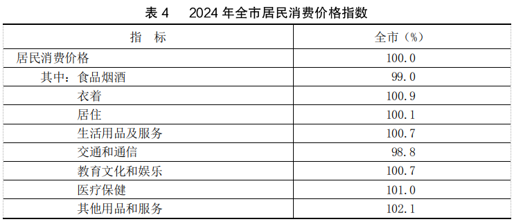 全年全市居民消費(fèi)價(jià)格總指數(shù)(CPI)100.0%,其中:食品煙酒類價(jià)格下降1.0%,衣著類價(jià)格上漲0.9%,居住類價(jià)格上漲0.1%,交通和通信類價(jià)格下降1.2%。