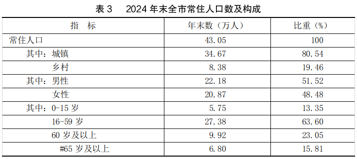 年末全市常住人口43.05萬人,比上年末減少0.15萬人。其中,城鎮(zhèn)人口34.67萬人,占常住人口比重(常住人口城鎮(zhèn)化率)為80.54%,比上年末提高0.71個(gè)百分點(diǎn)。全年出生人口0.31萬人,出生率為7.30‰;死亡人口0.46萬人,死亡率為10.63‰;人口自然增長率為-3.33‰。