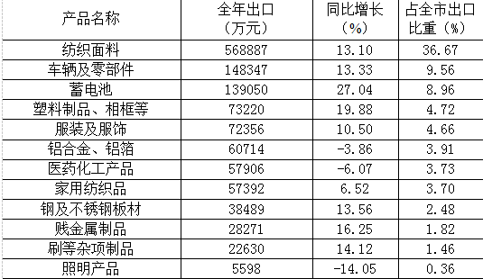 2024年,全市對亞洲出口51.16億元,同比增長7.3%,占出口總額33.0%;對拉丁美洲出口41.58億元,同比增長22.8%,占出口總額26.8%;對歐洲出口28.56億元,同比增長19.7%,占出口總額18.4%(主要出口地區(qū)情況見表二)。紡織產(chǎn)品出口額66.08億元,同比增長11.1%,占出口總額45.6%;車輛及零部件出口14.83億元,同比增長13.3%,占出口總額9.6%;蓄電池出口13.91億元,同比增長27.0%,占出口總額9.0%(主要出口產(chǎn)品情況見表三)。
