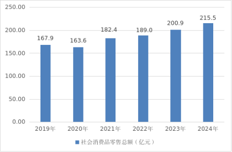 2024年全年社會消費品零售總額215.50億元,同比增長7.5%(圖三)。