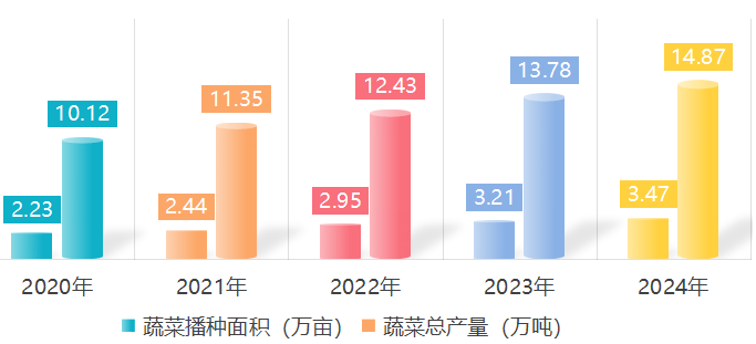 圖1:2020-2024年白銀區(qū)蔬菜播種面積、總產(chǎn)量