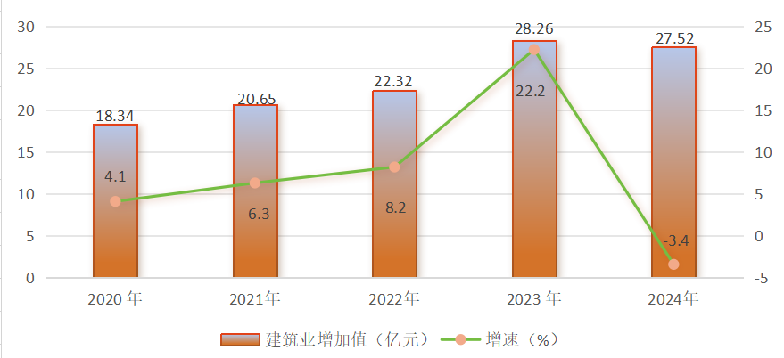 圖2:2020-2024年白銀區(qū)建筑業(yè)增加值及增長情況