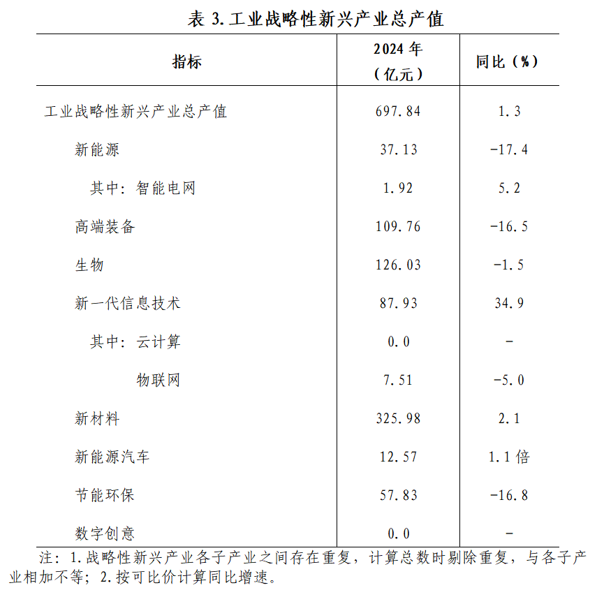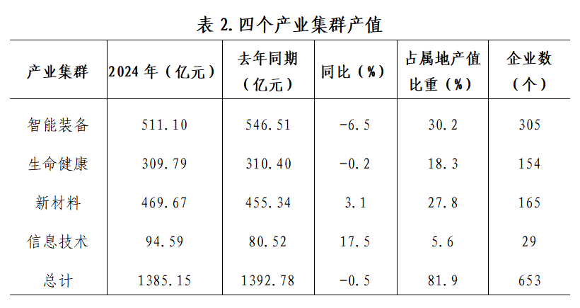 信息技術產業(yè)蓬勃發(fā)展。2024年,四個產業(yè)集群共有653家企業(yè),分屬于智能裝備、生命健康、新材料和信息技術,共完成工業(yè)產值1385.15億元,同比下降0.5%,占屬地規(guī)上工業(yè)總產值比重為81.9%,其中,信息技術產業(yè)同比增長17.5%(見表2);工業(yè)戰(zhàn)略性新興產業(yè)總產值完成697.84億元,按可比價計算,同比增長1.3%,占規(guī)上工業(yè)總產值比重為27.6%(見表3)。