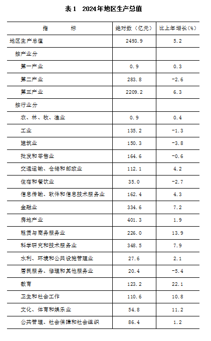 經(jīng)濟發(fā)展:初步核算,全年實現(xiàn)地區(qū)生產(chǎn)總值2493.9億元,按不變價格計算,比上年增長5.2%。其中,第一產(chǎn)業(yè)增加值0.9億元,增長0.3%;第二產(chǎn)業(yè)增加值283.8億元,下降2.6%;第三產(chǎn)業(yè)增加值2209.2億元,增長6.3%。三次產(chǎn)業(yè)構(gòu)成為0.04:11.4:88.6。按常住人口計算,全區(qū)人均地區(qū)生產(chǎn)總值為12.4萬元,比上年增長5.4%。