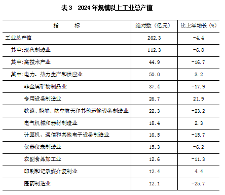 工業(yè):全年規(guī)模以上工業(yè)企業(yè)實現(xiàn)工業(yè)總產(chǎn)值262.3億元,比上年下降4.4%。從主要行業(yè)看,專用設(shè)備制造業(yè)增長21.9%,電力、熱力生產(chǎn)和供應(yīng)業(yè)增長3.2%,非金屬礦物制品業(yè)下降17.9%,鐵路、船舶、航空航天和其他運輸設(shè)備制造業(yè)下降23.2%。