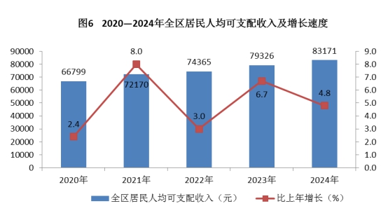 人民生活:全年全區(qū)居民人均可支配收入83171元,比上年增長4.8%。從收入構(gòu)成看,人均工資性收入50983元,增長6.4%;人均經(jīng)營凈收入1224元,增長14.4%;人均財產(chǎn)凈收入11147元,增長2%;人均轉(zhuǎn)移凈收入19817元,增長2.2%。