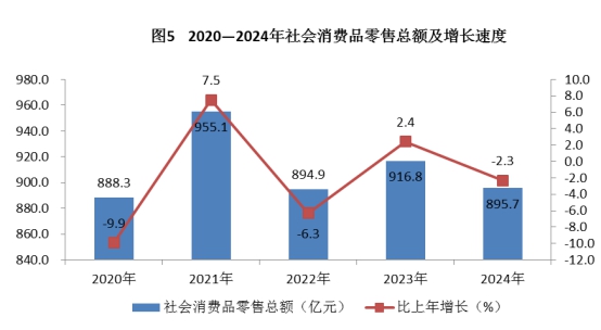 全年實現(xiàn)社會消費品零售總額895.7億元,比上年下降2.3%。