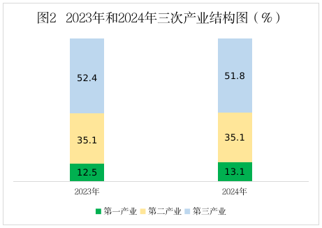 根據(jù)廣東省地區(qū)生產(chǎn)總值統(tǒng)一核算結(jié)果,2024年河源實(shí)現(xiàn)地區(qū)生產(chǎn)總值(初步核算數(shù))1407.72億元,比上年增長2.2%。其中,第一產(chǎn)業(yè)增加值184.44億元,增長5.0%,對地區(qū)生產(chǎn)總值增長的貢獻(xiàn)率為28.9%,拉動(dòng)地區(qū)生產(chǎn)總值增長0.6個(gè)百分點(diǎn);第二產(chǎn)業(yè)增加值493.78億元,增長3.0%,對地區(qū)生產(chǎn)總值增長的貢獻(xiàn)率為48.2%,拉動(dòng)地區(qū)生產(chǎn)總值增長1.1個(gè)百分點(diǎn);第三產(chǎn)業(yè)增加值729.50億元,增長0.9%,對地區(qū)生產(chǎn)總值增長的貢獻(xiàn)率為22.9%,拉動(dòng)地區(qū)生產(chǎn)總值增長0.5個(gè)百分點(diǎn)。三次產(chǎn)業(yè)結(jié)構(gòu)由上年的12.5:35.1:52.4調(diào)整為13.1:35.1:51.8,第一產(chǎn)業(yè)比重比上年提高了0.6個(gè)百分點(diǎn),第二產(chǎn)業(yè)比重與上年持平,第三產(chǎn)業(yè)比重比上年回落了0.6個(gè)百分點(diǎn)。人均地區(qū)生產(chǎn)總值49609元,增長2.2%。
