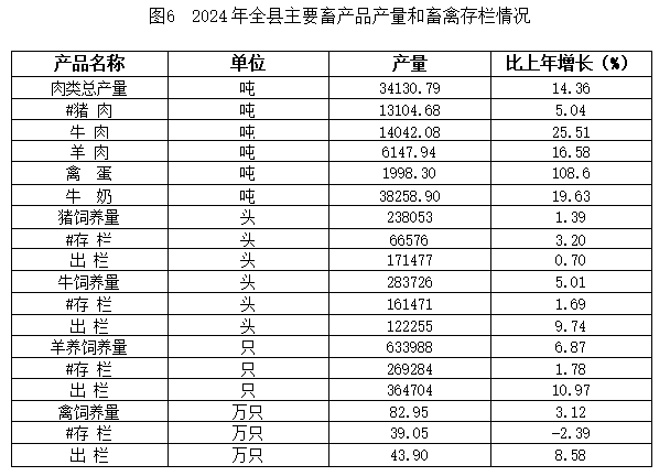 畜牧業(yè):完成退化草原治理1萬(wàn)畝,落實(shí)草原禁牧面積73.63萬(wàn)畝,草原綜合植被覆蓋度達(dá)30.83%,秸稈飼料化利用率達(dá)85.1%。累計(jì)建成標(biāo)準(zhǔn)化養(yǎng)殖場(chǎng)(區(qū))174個(gè),其中:肉牛養(yǎng)殖場(chǎng)區(qū)109個(gè),奶牛養(yǎng)殖場(chǎng)4個(gè),生豬養(yǎng)殖場(chǎng)(區(qū))38個(gè)。年末大牲畜存欄17.01萬(wàn)頭(匹),增長(zhǎng)1.82%,出欄12.29萬(wàn)頭(匹),增長(zhǎng)8.46%,其中:牛存欄16.14萬(wàn)頭,增長(zhǎng)1.69%,出欄12.23萬(wàn)頭,增長(zhǎng)9.74%;豬存欄6.66萬(wàn)頭,增長(zhǎng)3.2%,出欄17.15萬(wàn)頭,增長(zhǎng)0.7%;羊存欄26.93萬(wàn)只,增長(zhǎng)1.78%,出欄36.47萬(wàn)只,增長(zhǎng)10.97%;家禽存欄39.05萬(wàn)只,下降2.39%,出欄43.9萬(wàn)只,增長(zhǎng)8.58%。全年肉類(lèi)總產(chǎn)量3.41萬(wàn)噸,增長(zhǎng)14.36 %;禽蛋產(chǎn)量0.19萬(wàn)噸,增長(zhǎng)108.6%;牛奶產(chǎn)量3.83萬(wàn)噸,增長(zhǎng)19.63%。