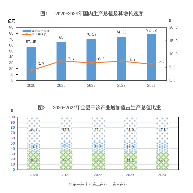 初步核算,實(shí)現(xiàn)生產(chǎn)總值79.68億元,比上年增長(zhǎng)6.1%。其中:一產(chǎn)增加值26.35億元,增長(zhǎng)7.7%;二產(chǎn)增加值15.26億元,增長(zhǎng)10.8%;三產(chǎn)增加值38.07億元,增長(zhǎng)3.3%。三次產(chǎn)業(yè)結(jié)構(gòu)比由上年的35.1:16.9:48.0調(diào)整為33.1:19.1:47.8,與上年相比,第一產(chǎn)業(yè)下降2個(gè)百分點(diǎn),第二產(chǎn)業(yè)上升2.2個(gè)百分點(diǎn),第三產(chǎn)業(yè)下降0.2個(gè)百分點(diǎn)。按常住人口計(jì)算,人均生產(chǎn)總值71242元,增長(zhǎng)7.1%。