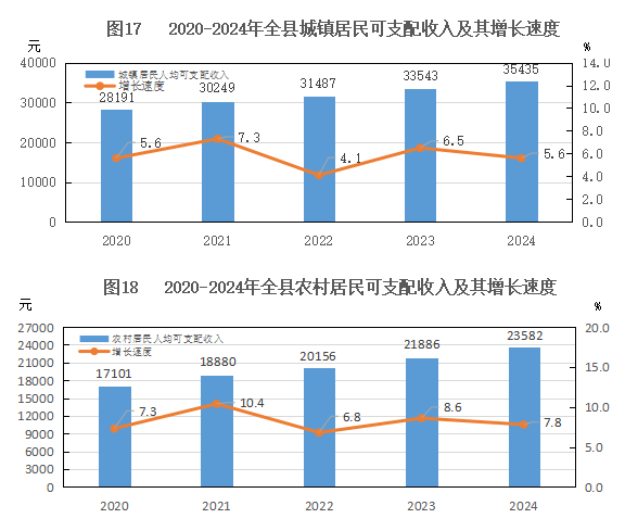 居民收入和消費(fèi):全縣城鎮(zhèn)居民人均可支配收入35434.6元,增加1891.8元,增長(zhǎng)5.6%。農(nóng)村居民人均可支配收入23581.7元,增加1696.2元,增長(zhǎng)7.8%。城鎮(zhèn)居民人均生活消費(fèi)支出26930.3元,增加1527.8元,增長(zhǎng)6.0%;農(nóng)村居民人均生活消費(fèi)支出19431.1元,增加1166.4元,增長(zhǎng)6.4%。城鎮(zhèn)居民恩格爾系數(shù)為31.5 %,上升0.5個(gè)百分點(diǎn);農(nóng)村居民恩格爾系數(shù)為30.4%,上升0.6個(gè)百分點(diǎn)。