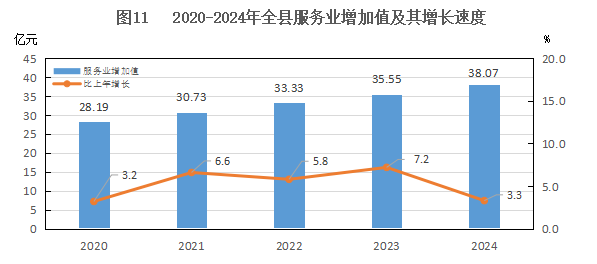全年實(shí)現(xiàn)服務(wù)業(yè)增加值38.07億元,增長(zhǎng)3.3%。其中:批發(fā)零售業(yè)增加值6.26億元,增長(zhǎng)7.9%;交通運(yùn)輸業(yè)增加值3.85億元,增長(zhǎng)5.4%;住宿和餐飲業(yè)增加值1.64億元,增長(zhǎng)6.3%;金融業(yè)增加值4.59億元,增長(zhǎng)6%;房地產(chǎn)業(yè)增加值2.65億元,增長(zhǎng)1%;營(yíng)利性服務(wù)業(yè)增加值5.24億元,下降3.5%;非營(yíng)利性服務(wù)業(yè)增加值11.23億元,增長(zhǎng)2.2%。