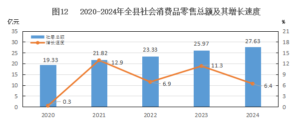 全縣實(shí)現(xiàn)社會(huì)消費(fèi)品零售總額27.63億元,增長(zhǎng)6.4%。按經(jīng)營(yíng)地統(tǒng)計(jì),城鎮(zhèn)消費(fèi)品零售額17.7億元,增長(zhǎng)6.1%,鄉(xiāng)村消費(fèi)品零售額9.93億元,增長(zhǎng)7%。按消費(fèi)形態(tài)統(tǒng)計(jì),商品零售25.48億元,增長(zhǎng)6.1%;餐飲收入2.15億元,增長(zhǎng)9.8%。
