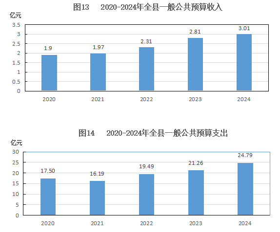 財(cái)政:全縣一般公共預(yù)算收入3.01億元,增長(zhǎng)6.9%,其中:稅收收入1.61億元,增長(zhǎng)9.6%。一般公共財(cái)政預(yù)算支出24.79億元,增長(zhǎng)16.6%。
