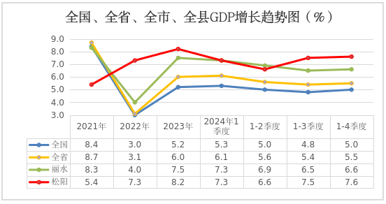 2024年,松陽堅持以習近平新時代中國特色社會主義思想為指導,全面貫徹黨的二十屆三中全會、中央經(jīng)濟工作會議、省委十五屆六次全會、省“兩會”和市委五屆七次全會精神,堅持穩(wěn)中求進工作總基調(diào),完整、準確、全面貫徹新發(fā)展理念,扎實推進三個“一號工程”和“十項重大工程”,精準落實“1+4+12”行動方案,經(jīng)濟總量再上新臺階,社會大局和諧穩(wěn)定,高質(zhì)量發(fā)展扎實推進,主要預期目標圓滿實現(xiàn)。