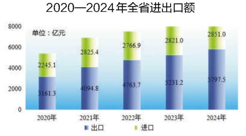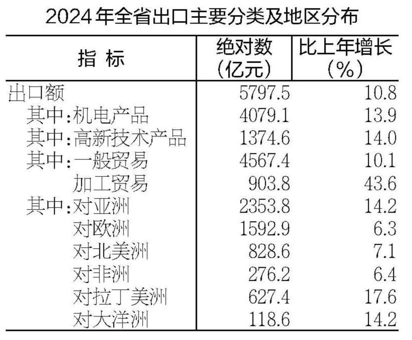 全年貨物進(jìn)出口總額8648.5億元,比上年增長7.4%。其中,出口5797.5億元,增長10.8%;進(jìn)口2851.0億元,增長1.0%。從出口商品看,機(jī)電產(chǎn)品出口增長13.9%,高新技術(shù)產(chǎn)品出口增長14.0%。電動(dòng)汽車、鋰離子蓄電池、光伏產(chǎn)品“新三樣”合計(jì)出口490.1億元,增長23.6%。對共建“一帶一路”國家進(jìn)出口4632.6億元,增長6.3%。其中,出口3063.0億元,增長11.0%;進(jìn)口1569.6億元,下降1.7%。