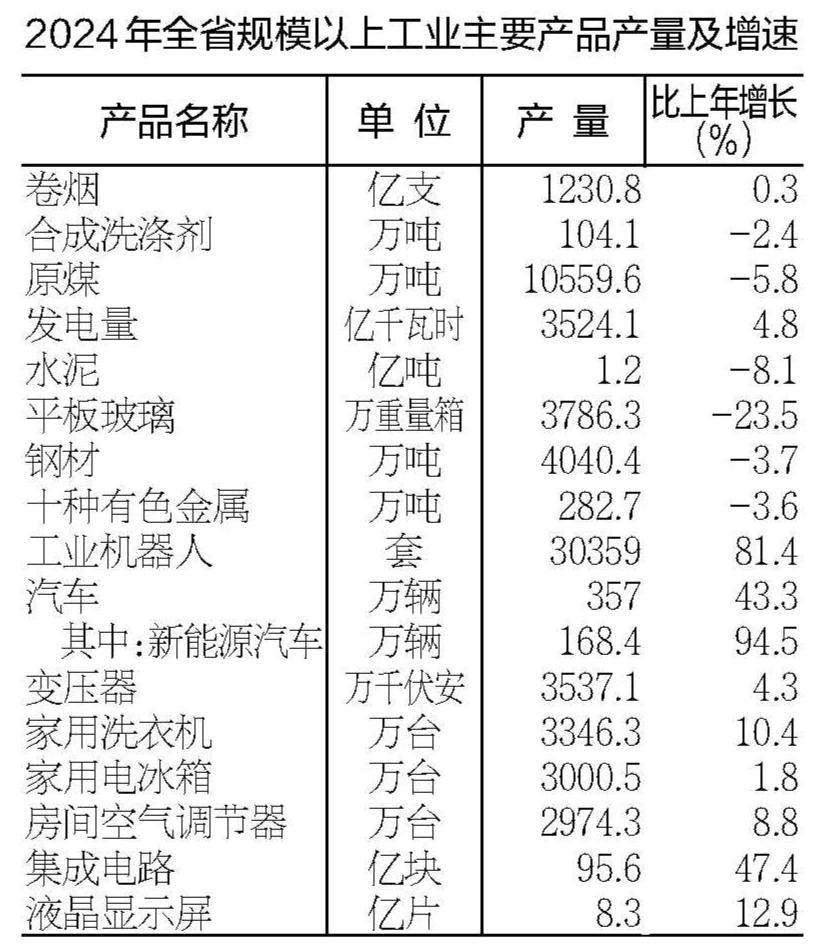 全年規(guī)模以上工業(yè)增加值比上年增長9.0%。分經(jīng)濟(jì)類型看,國有控股企業(yè)增加值增長3.6%;股份制企業(yè)增長9.0%;外商及港澳臺商投資企業(yè)增長9.4%。分門類看,采礦業(yè)增加值下降1.5%,制造業(yè)增長10.3%,電力、熱力、燃?xì)饧八a(chǎn)和供應(yīng)業(yè)增長6.9%。分行業(yè)看,41個(gè)工業(yè)大類行業(yè)中有35個(gè)行業(yè)增加值保持增長。其中,計(jì)算機(jī)、通信和其他電子設(shè)備制造業(yè)增長26.1%,汽車制造業(yè)增長26.7%,通用設(shè)備制造業(yè)增長10.1%,電氣機(jī)械和器材制造業(yè)增長8.9%,化學(xué)原料和化學(xué)制品制造業(yè)增長8.9%。工業(yè)產(chǎn)品中,集成電路和液晶顯示屏產(chǎn)量分別增長47.4%和12.9%,汽車產(chǎn)量增長43.3%、其中新能源汽車增長94.5%。
